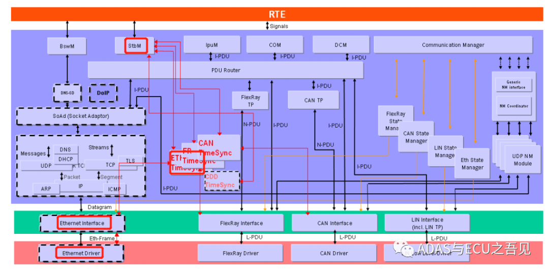 AUTOSAR层级关系 按照AUTOSAR标准文档规范,有关EthTsync模块在整个AUTOSAR车载以太网协议栈的具体位置描述如下图1所示: