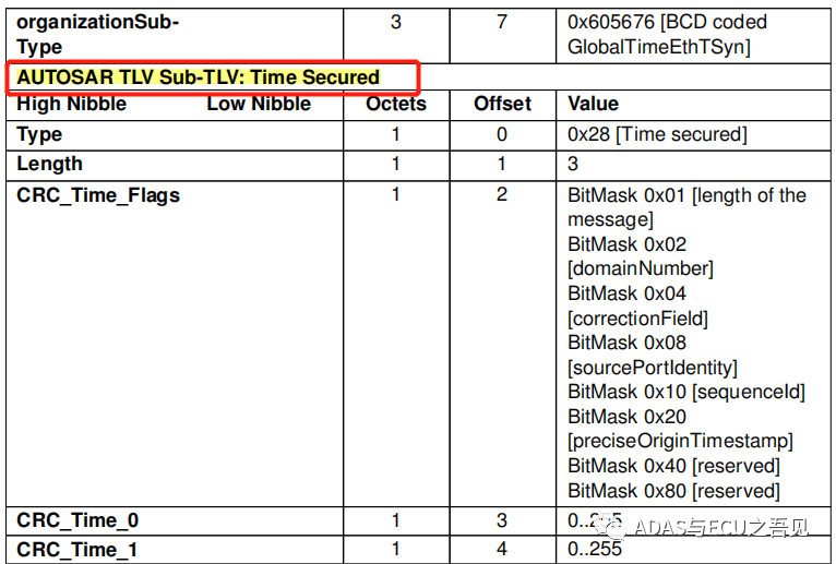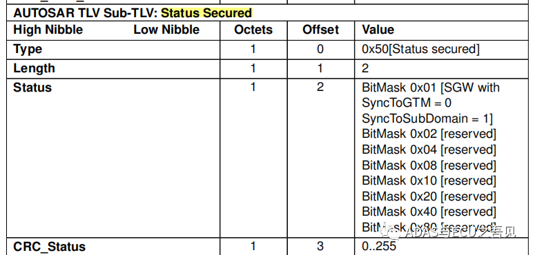 图14 AUTOSAR规范下Follow up报文新增TLV字段定义 由于AUTOSAR规范下的新增TLV内容较多,主要是针对各种TLV做的CRC计算规则会有些许差异,基本原理一致,不复杂,由于篇幅原因,小T就不过多对这些TLV进行赘述,大家可自行进行研究。