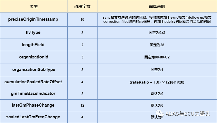 图12 IEEE802.1AS规范下Follow up报文Payload定义 如下图13所示为IEEE802.1AS规范下Follow up报文Payload与标准TLV字段解释说明: