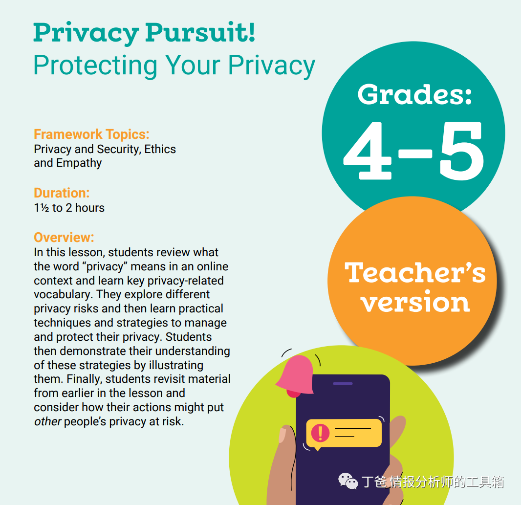 在本课中,学生复习了在线语境中“隐私”一词的含义,并学习与隐私相关的关键词汇。他们探索不同的隐私风险,然后学习实际的技术和策略来管理和保护他们的隐私。学生然后通过说明这些策略来展示他们对这些策略的理解。最后,学生们重新审视课上早先的材料,并考虑他们的行为可能如何危及他人的隐私。