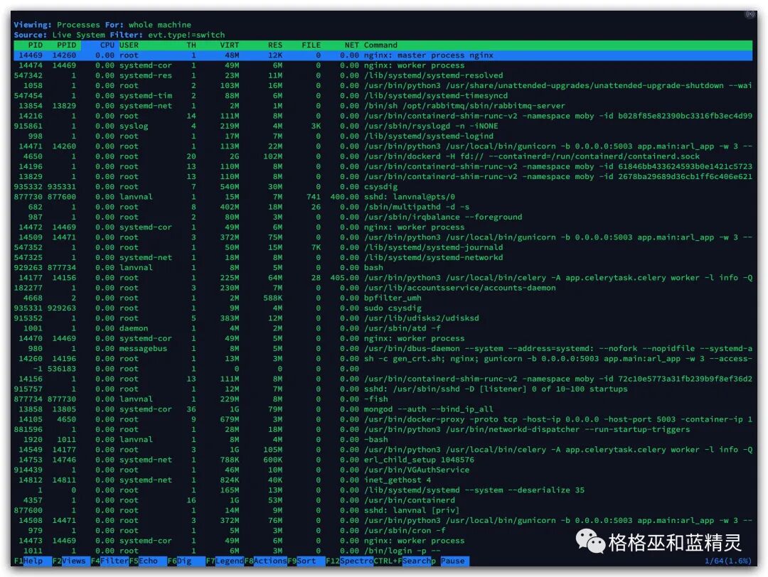 csysdig使用的时候,最下面给出了一些操作的按键提示。这里记录一些在学习使用过程中值得注意的: