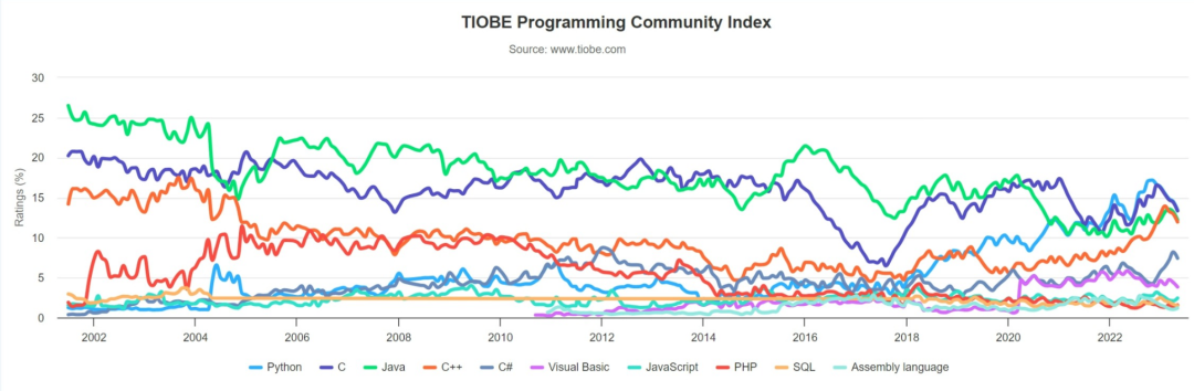 Top 10 编程语言 TIOBE 指数走势(2002-2023)