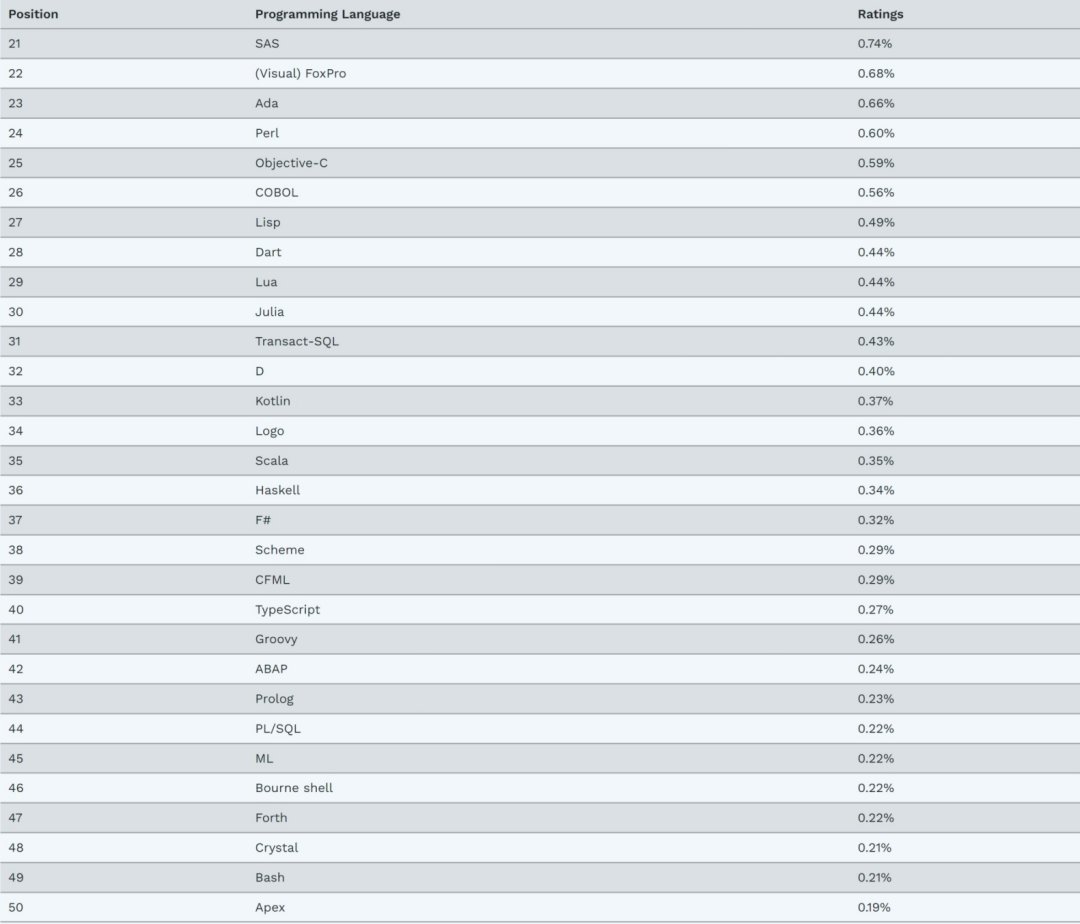4th Dimension/4D, ABC, Algol, Alice, APL, AutoHotkey, Awk, bc, Boo, C shell, CL (OS/400), CLIPS, Clojure, CoffeeScript, Common Lisp, Eiffel, Elixir, Elm, Erlang, GAMS, Hack, Icon, IDL, Io, J, J#, JScript, LabVIEW, Ladder Logic, NATURAL, Nim, OCaml, OpenEdge ABL, PL/I, Pony, PowerShell, Q, Racket, Raku, RPG, S, Smalltalk, Snap!, Solidity, SPARK, Tcl, VBScript, VHDL, X++, Zig