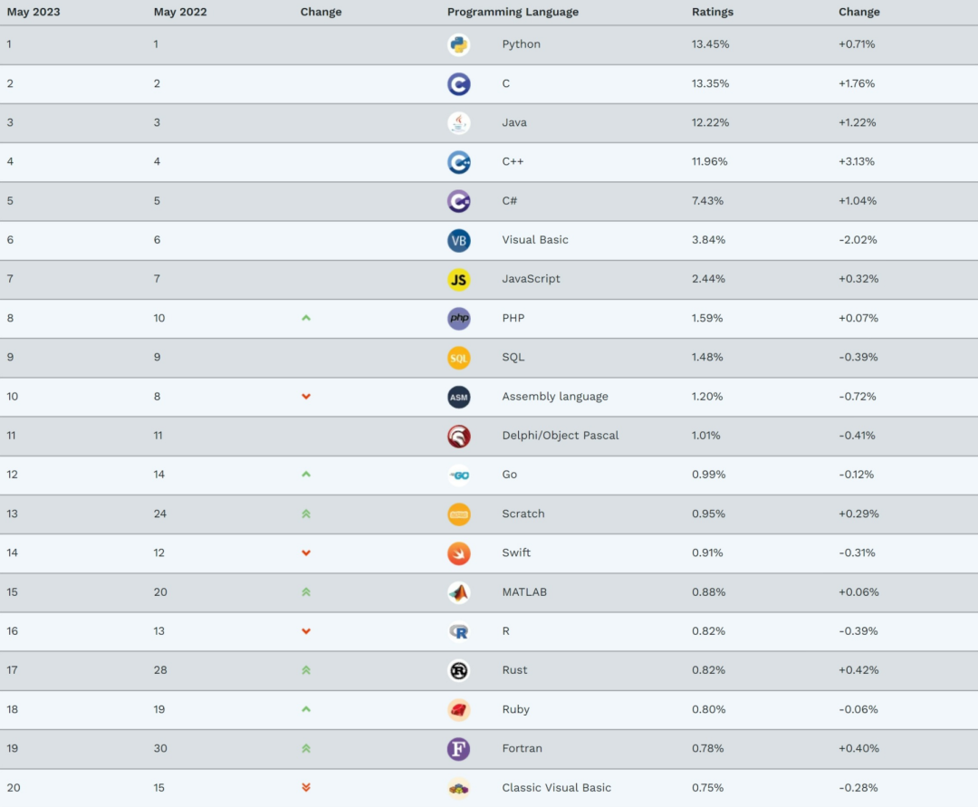 除此之外,纵观 TOP 20 还可以发现,多数都是诞生超过 10 年的编程语言,唯二小于“10 岁”的 Swift(2014 年发布)和 Rust(2015 年发布),也都至少存在了 5 年。对此,TIOBE CEO 鼓励道:“一门新编程语言几乎不可能冲击排行榜,所以如果你刚刚发明了一种全新的语言,请有一些耐心吧。”