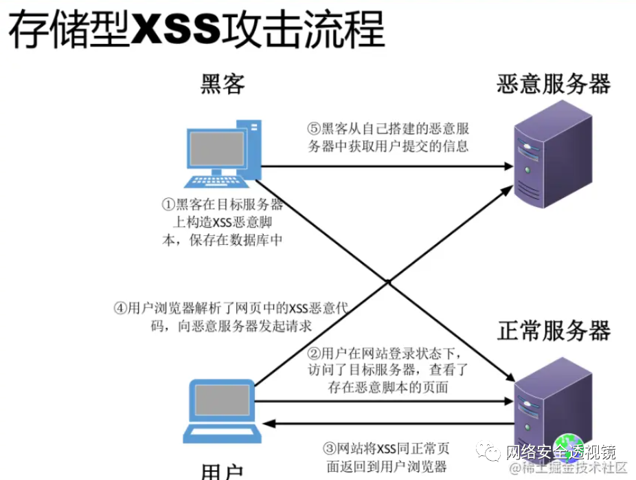 存储型(或 HTML 注入型/持久型)XSS 攻击最常发生在由社区内容驱动的网站或 Web 邮件网站,不需要特制的链接来执行。黑客仅仅需要提交 XSS 漏洞利用代码(反射型XSS通常只在url中)到一个网站上其他用户可能访问的地方。这些地区可能是博客评论,用户评论,留言板,聊天室,HTML 电子邮件,wikis,和其他的许多地方。一旦用户访问受感染的页,执行是自动的。