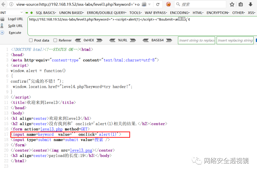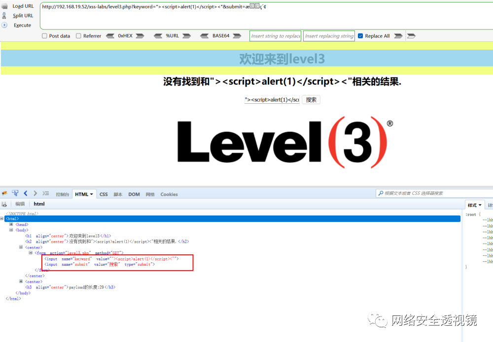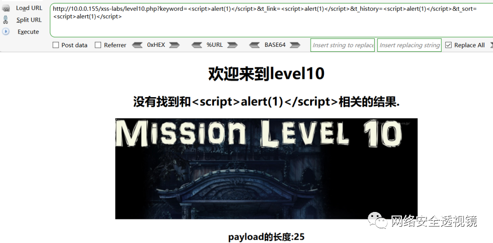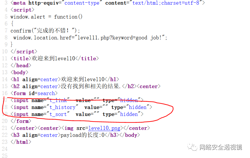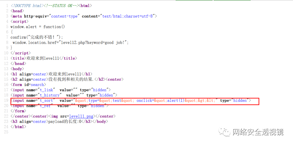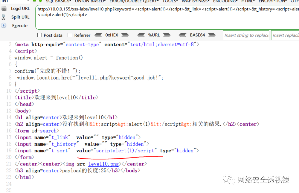 ,也是隐藏表单,只不过这里是有两个参数可以接收并返回在了html的value中,分别是t_sort参数和t_ref参数,但是t_sort参数输入第十关的payload: