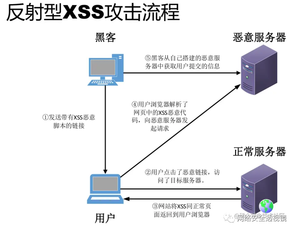 反射型XSS只是简单的把用户输入的数据从服务器反射给用户浏览器,要利用这个漏洞,攻击者必须以某种方式诱导用户访问一个精心设计的URL(恶意链接),才能实施攻击。