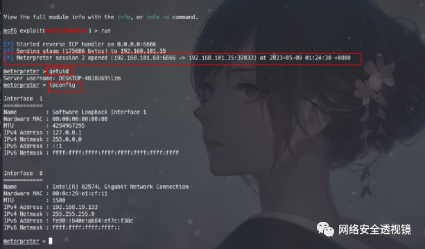 4、攻击机开启监听,等待受害者运行捆绑木马的程序,运行后即可上线,拿到受害者主机控制权限
