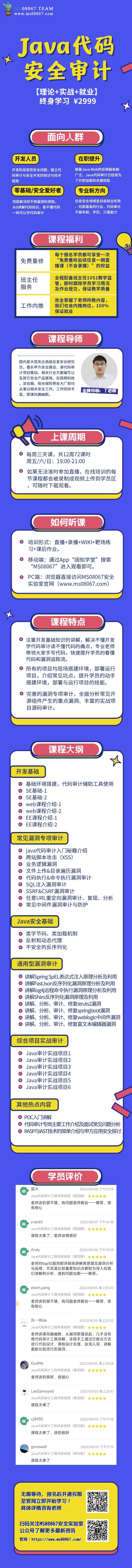 授课老师讲的内容很多、很详细,仅看wiki就能学到不少知识,从基础的搭建环境➡JAVASE ➡JavaWEB ➡JavaEE ➡常见漏洞审计(SQL注入、XSS注入、命令执行等)➡反射机制、反序列化➡组件漏洞审计(fastjson、shiro、log4j2等)➡6个实战项目分析➡编写POC ➡代审岗位面试总结。