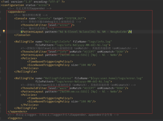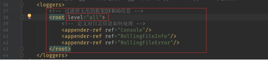 因为代码里面还会有第二次过滤,是通过遍历appenders子元素里面的每一个级别来进行过滤的。