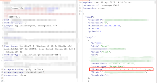 再用另一个queryFile接口查看是否上传成功,可看到这里已经上传成功,并且后缀是jsp。