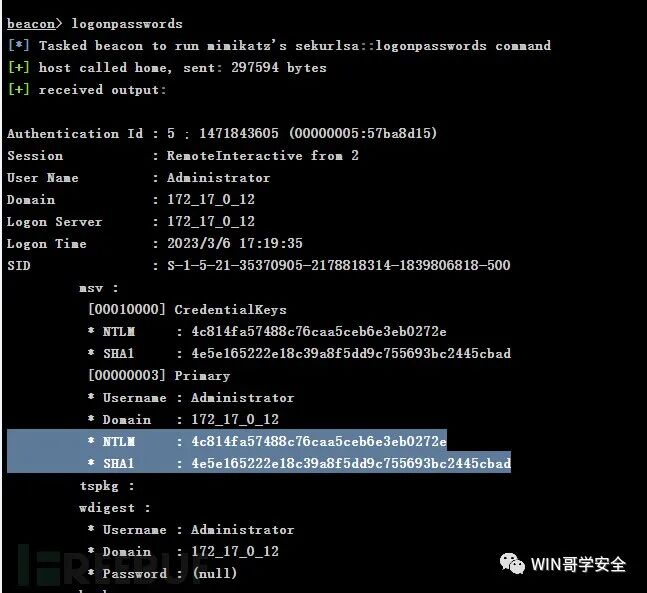 因为无法获取明文密码,直接修改管理员密码稍有些不妥。尝试通过获取管理员NTLM远程登录机器。(并非同一台,这只是提供一个思路)