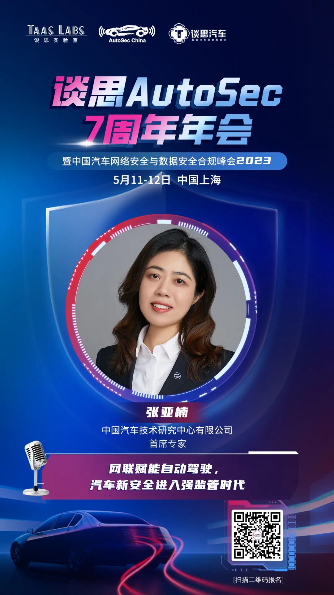 此次,中国汽车技术研究中心有限公司首席专家张亚楠女士,将在谈思AutoSec 行业7周年年会上分享“ 网联赋能自动驾驶,汽车新安全进入强监管时代 ”的精彩话题。