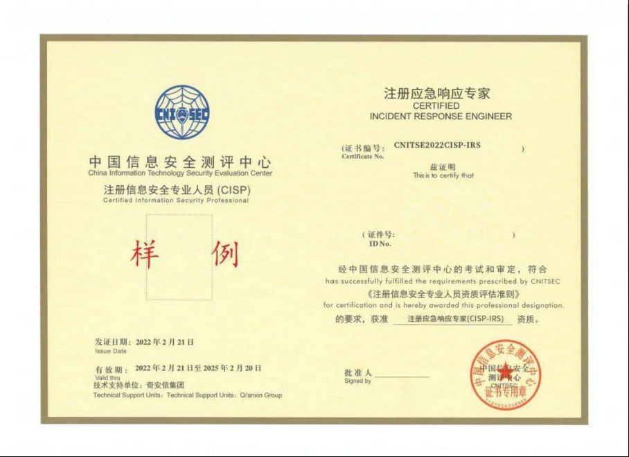 CISP-IRS(英文名Certified Information Security Professional - Incident Response specialist)中文全称国家注册信息安全应急响应专家认证。证书持有人员主要从事信息安全技术领域应急响应工作,除了具有了解应急响应概况、应急响应基础、应急响应事件监测、应急响应事件分析和处置的基本知识和能力外,还具有各种攻击和防御技巧、较强的攻击溯源、处理复杂攻击应急响应等知识和能力。