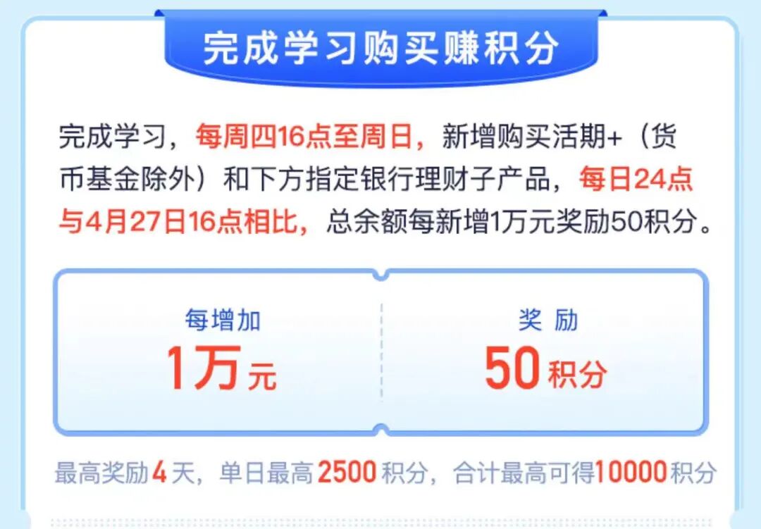 凡是在周四下午三点-周日期间,买入活期+及指定产品,每1万元,补贴50积分/天,最高一天补贴2500元积分。