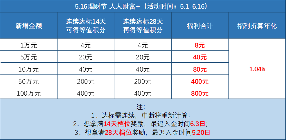 买入活期+金额达到以下标准,且连续持有满14天/28天,就可以拿到对应积分,积分价值直接在表格里帮你们换算好了: