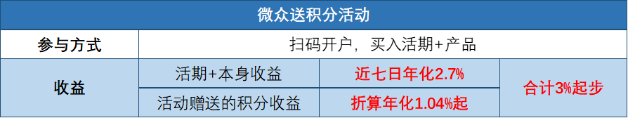 而现在买入,参与活动,除了能拿到产品本身2.7%左右的收益外,还有额外积分赠送。