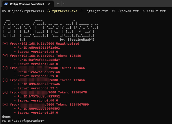 Usage of ./frpCracker:-l string输入文件,支持IP:Port格式,一行一个-o string输出文件 (default "result.txt")-t int线程数量 (default 20)-tl stringToken的输入文件,一行一个-v string指定爆破时客户端的版本 (default "0.48.0")