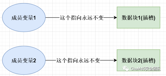 任何一个成员变量永远都只会指向属于自己的数据块(插槽),是一对一的关系,不存在一对多、多对一、多对多的情况,如图: