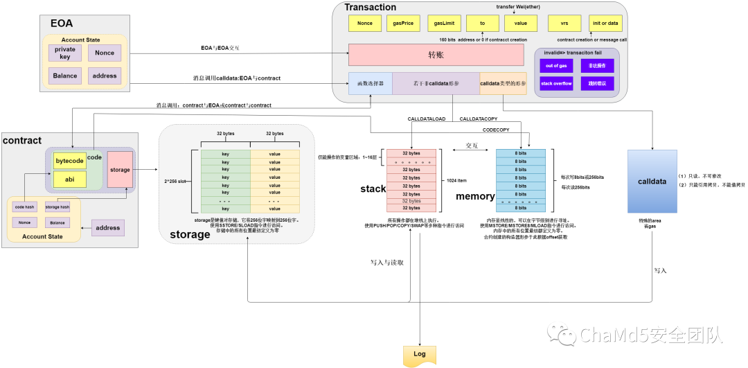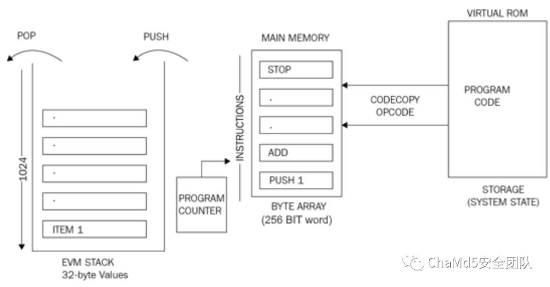 storage是永久存储在区块链上的地方。如果你想操作storage中的数据,你可以将它复制到内存中。然后,所有内存代码都在堆栈上执行。Stack 的最大深度为 1024 个元素,支持 256 位的字长。