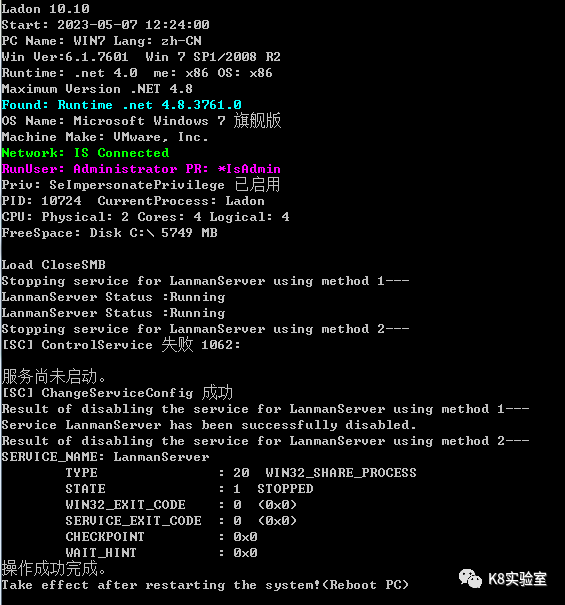 重启系统后生效,然后你会发现无法即便不打补丁,无法通过17010等SMB漏洞,就算有23010的0day也无法攻击,有密码也无法通过Ladon、impacket等工具的smbexec、atexec等横向移动,ntlm中继也不行。