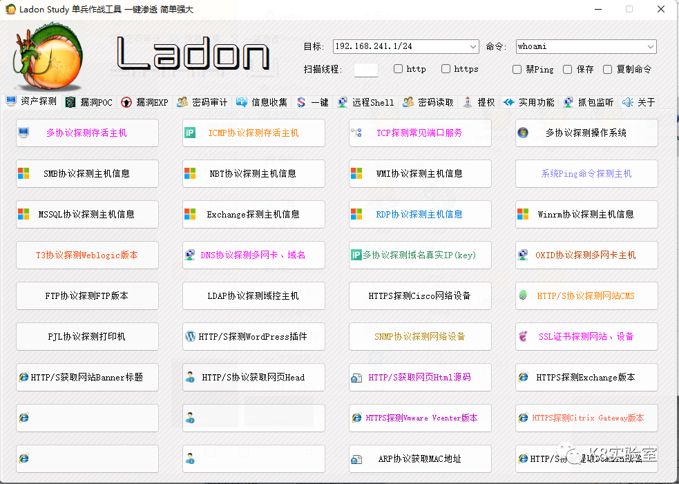 很多人写个工具就TM就几个简单功能,存在一大堆Bug,几年都没写好,Ladon这么多个功能有些模块(很多模块可理解为一个工具)有Bug也是非常正常的。所以希望大家积极反馈Bug,公开工具的目的就是让大家发现Bug,方便完善让其更好用。要是怕大家说程序有BUG,可以完全私用,然后吹自己工具兼容性多么牛,功能多好用,实际上就少数人用,很多环境都没遇到,能发现几个BUG,等遇到了专门甩锅目标环境问题?一个通用兼容性好的工具,肯定要提前适应各种环境。因为真正的实战不可能只用一两个工具,不能把时间浪费在原本就可以提前完成的工作上,在某个环节上省了很多时间,就有更多时间专心解决其它问题,所以Ladon基本上都是业余时间有空才更新。