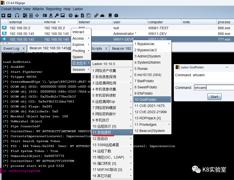 PS: RunUser一般用于system降权至用户,如VNC或C2查看桌面,该功能自Ladon 6.4开始就存在 模块名称为GetSystem