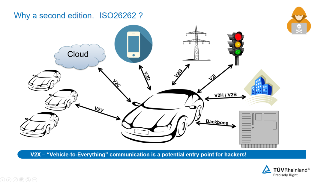 未来的车辆与外界的高度连通性必将引入新的挑战,包括连接车辆的控制功能、IT后端的系统和其他外部信息源之间的新接口等,丰富的攻击面增加了风险。由此就会引入一个新的课题:网络安全,所以2018版ISO 26262标准中也引申到网络安全的问题。