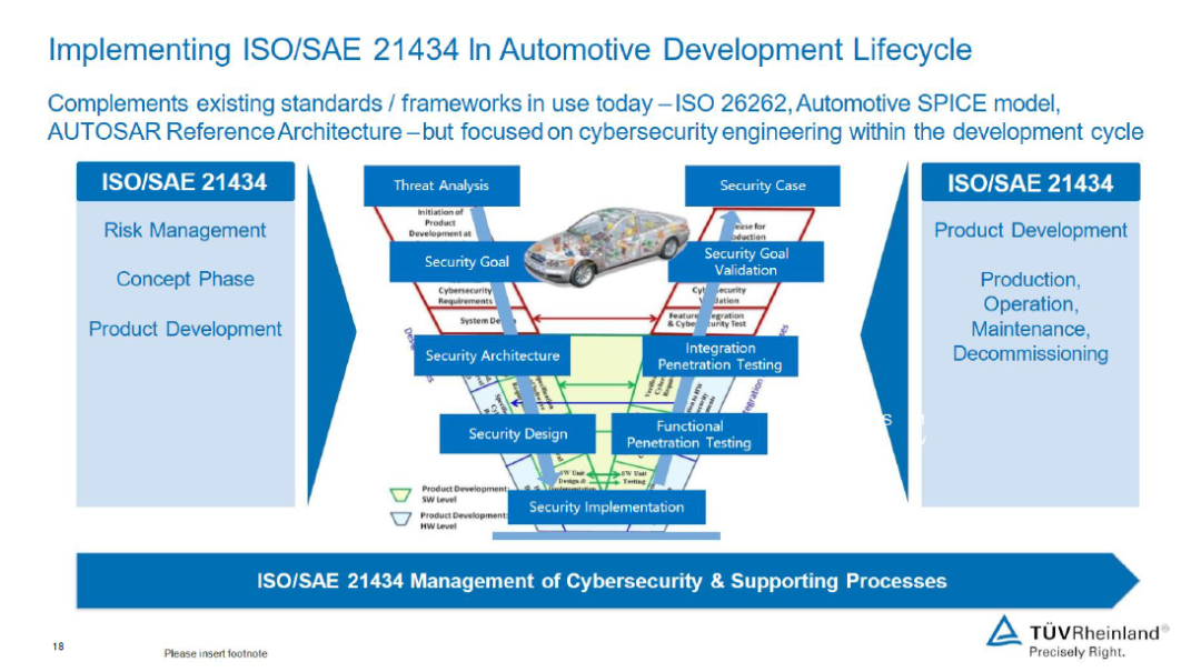该标准中包含了网络安全过程中的一些要求,既有网络安全管理的要求,提供了涵盖企业组织层面和具体项目层面的指南,帮助企业将网络安全管理的措施实施落地;也有风险管理方面的要求,基于一些常规的风险管理方法和分析方法,执行威胁分析和风险评估,对风险进行计算并及时响应。从标准整体框架中可以看到,一方面基于网络安全的管理、风险的管理,以及支持类的管理要求,是贯穿在整个生命周期开发过程中的,接下来按照Concept,产品系统级开发,以及产品交付以后的生产,运营维护报废等不同阶段。