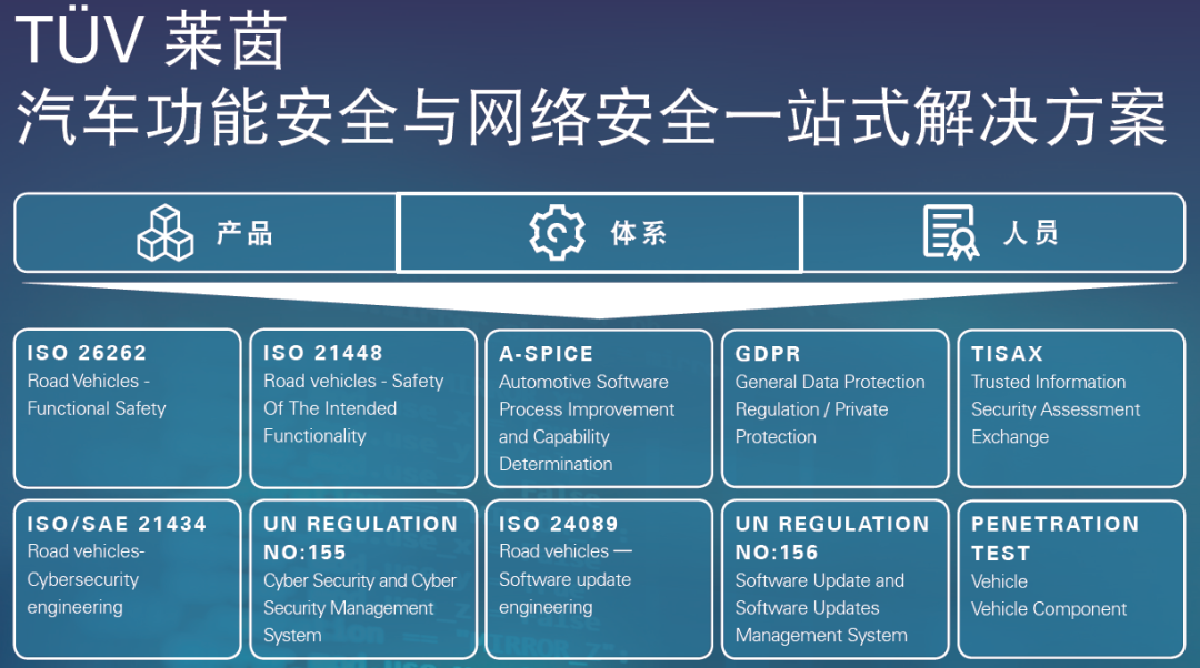 TÜV莱茵一直是汽车检测认证领域的领导者,可为整车厂和零部件供应商提供一站式解决方案。在汽车功能安全和网络安全领域,TÜV莱茵提供的服务涵盖ISO/SAE 21434、ISO 26262、Automotive SPICE、GDPR、渗透测试等,满足企业“全面安全”的需要。