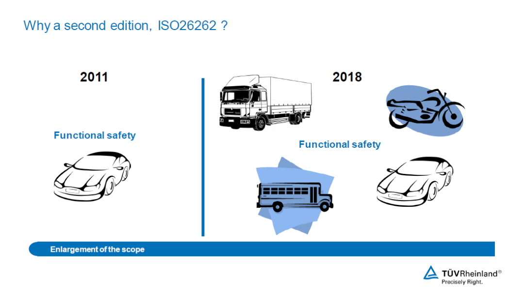 与2011版标准相比,2018版标准增加了第11部分和第12部分。第11部分是针对半导体的,主要列出了ISO 26262要求应用于半导体开发的相关准则;第12部分扩充了标准的适用范围,不仅针对3.5吨以下量产乘用车,像商用车、卡车、摩托车等都纳入了标准范围内,同时还将摩托车部分单独拟定了标准。