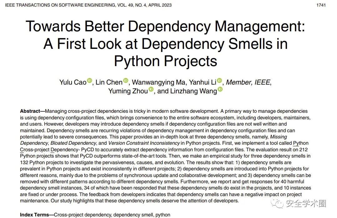 在现代软件开发中管理跨项目依赖是一件非常棘手的事情。依赖管理的一种主要方式是使用依赖配置文件,其出现给整个软件生态中的各方用户带来了极大的便利。然而,当依赖配置文件没能很好地编写和维护时,开发者则可能在项目中引入dependency smell。dependency smell因编写者在依赖配置文件中反复违反依赖管理招致,并且可能会潜在地导致严重后果。在这篇论文中作者从Python项目入手深入研究了三种dependency smell:1)Missing Dependency(MD);2)Bloated Dependency(BD);3)Version Constraint Inconsistency(VCI)。作者团队实现了一个名为 Python Cross-project Dependency(PyCD)的工具来准确提取配置文件中的依赖信息。该工具在212个Python项目上表明其超过了目前SOTA的方法。随后作者团队在132个Python项目上调查了三种dependency smell的普遍性、成因以及演化过程。结果表明:1)dependency smell在Python项目中十分普遍,并且在不同项目中各不一致;2)dependency smell出于各种原因被引入到项目中,主要是由于同步更新以及协作开发导致;3)dependency smell可以按照不同的类型以不同的模式移除。此外,作者团队报告并获得了来自40个有害dependency smell实例的响应,其中的34个已响应的dependency smell确实存在于项目中,其中的10个实例已经被修复或正在处理。来自开发者的反馈表明这些dependency smell确实对项目维护存在消极影响。