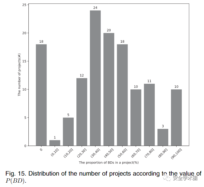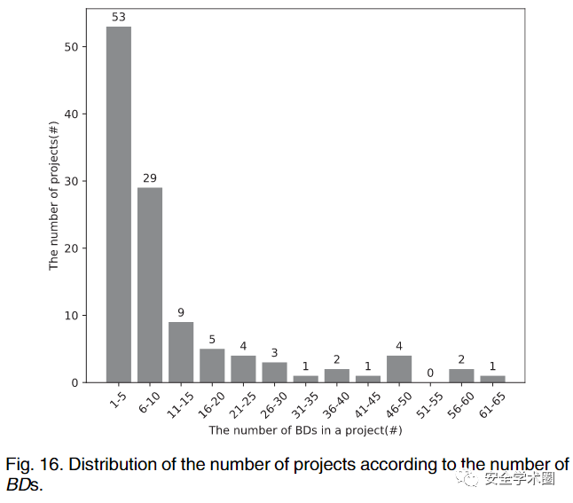 最终作者得到了114个smell的实例,其中29个已经被修复。在将所有的dependency smell汇总至同一个项目后,作者团队一共报告了39个issue,其中29个issue包含29个MD实例,11个issue包含13个BD实例,2个issue包含2个VCI实例。
