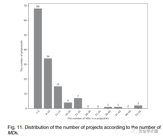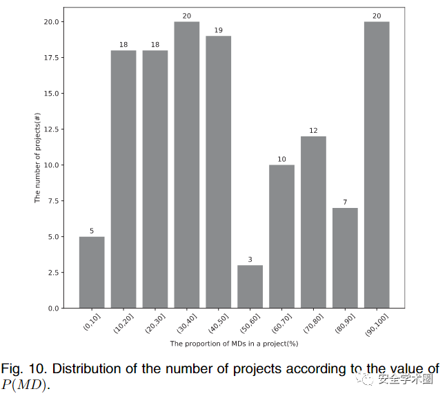 MD: 作者使用缺失的依赖数目与源码使用依赖数量之比来描述MD的比例,并统计了各项目中的依赖缺失情况。