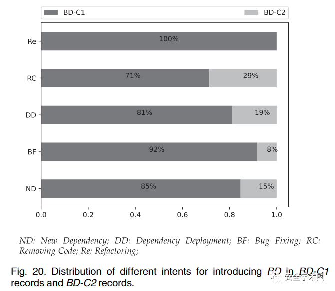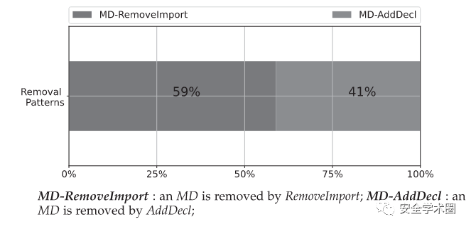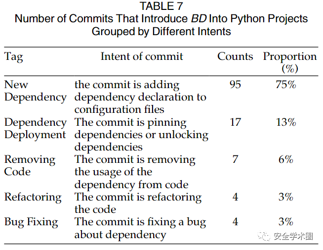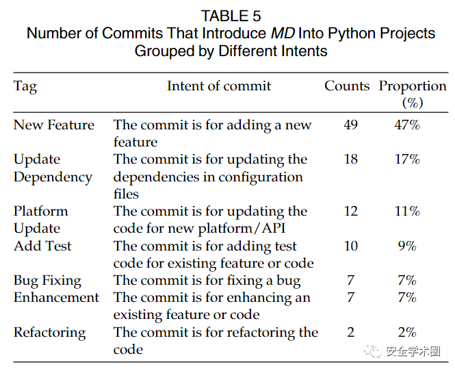 而对于MD的成因分析,作者选择了从仓库的commit入手进行分析。简单而言,作者首先定位了那些存在依赖缺失问题的源码文件,并分析每个commit中对应文件的依赖变化情况。最后,作者将开发者引入MD的各种意图进行了总结。