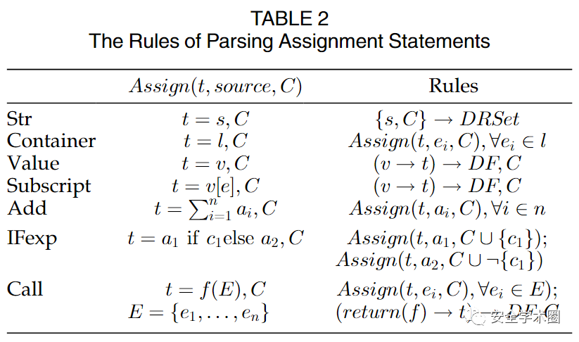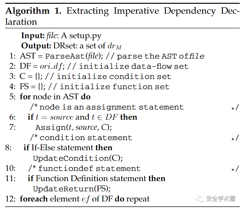具体的提取算法如算法1所示。在给定一个setup.py文件后,带有四个依赖参数的数据流集合DF,条件集合C以及函数集合FS会被初始化。在解析过程中,算法主要对三类语句进行处理:1)赋值语句,判断目标值是否在DF中,然后通过表2中的规则进行处理;2)条件判断语句,记录上下文信息并更新条件集合C;3)函数定义语句,记录函数返回值并更新函数集合FS。