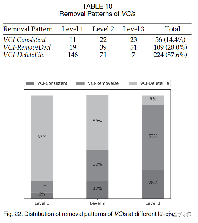 在对VCI的变化过程进行分析时,作者首先定义了VCI的三种移除模式:1)更新版本约束(Consistent),将配置文件中的冲突依赖版本置为相同状态;2)删除配置文件(DeleteFile),删除任一存在冲突的配置文件;3)移除依赖声明(RemoveDecl),删除任一存在冲突的配置文件中的相应依赖声明。最终的统计结果如下。