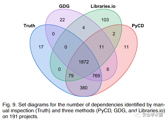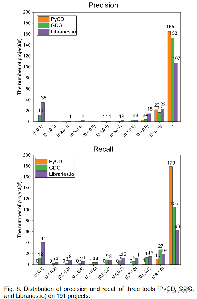 作者在212个项目上选取了两种常用的工具进行对比:1)Github's Dependency Graph(GDG);2)Libraries.io。并选取了精度与召回率作为评价指标,即正确识别的依赖占所有识别依赖的比例以及占所有实际依赖的比例,结果如下图所示。