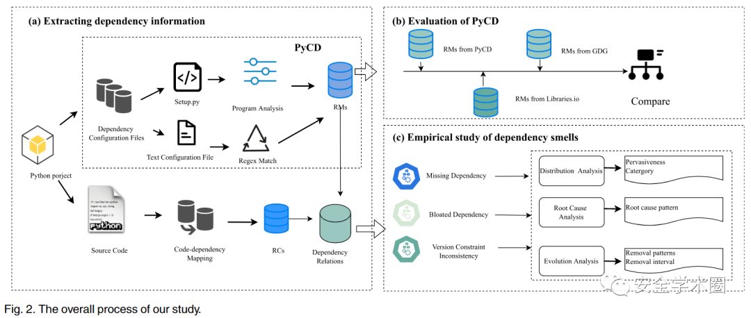 作者整体的研究框架如下所示,包含工具PyCD实现,工具对比以及对三种dependency smell的观察研究。