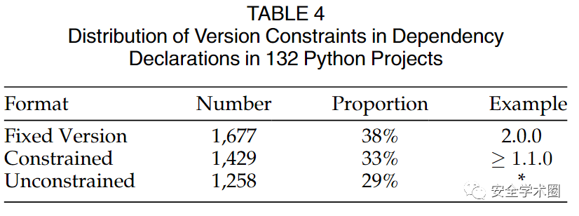 作者从这132个Python项目中提取了依赖关系,并将其分为三类:fixed version,constrained以及unconstrained。