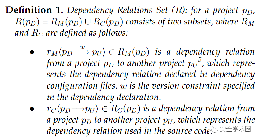 首先作者对项目之间的依赖关系进行定义,依据其是否存在版本约束分为两类,和分别代表上游项目和下游项目: