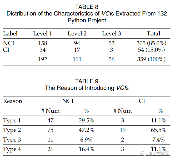 对于VCI的成因分析,作者采用了一种严谨的分析方法:第一作者对数据集中的VCI按照此前划分的三种等级进行分层采样。随后第一作者随机采样了其中的50个VCI实例,并对其成因进行分析,基于观察生成了一系列类别。最后另外三位作者对划分的类别进行检查以生成最终类别。最后使用敲定的类别对剩余的VCI实例进行标记,并在标记过程中讨论出现的异议直至达成共识。最后一共划分了四类成因: