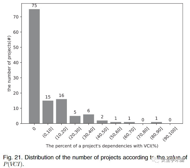 作者使用版本约束不一致的依赖数量与配置文件声明依赖数量之比来描述VCI的比例,并统计了各项目中的依赖版本约束不一致的情况。