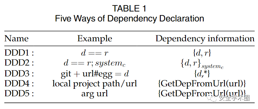 作者依据依赖关系的声明位置将其分为了两类:1)Declarative Dependency Declaration(DDD),该部分依赖存在于文本类配置文件,如requirements.txt以及Pipfile等;2)Imperative Dependency Declaration(IDD),存在于可执行文件中,如setup.py。