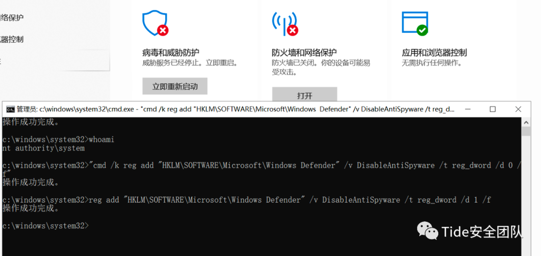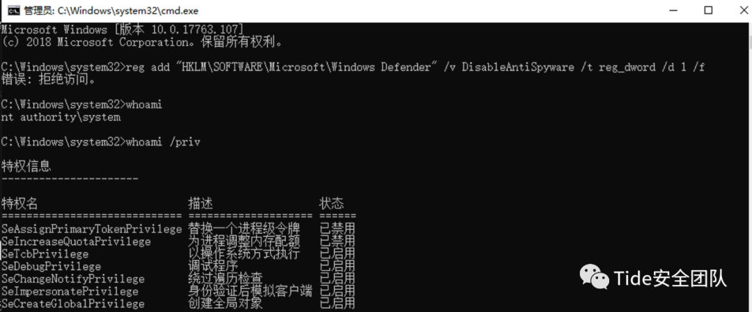 reg add "HKLM\SOFTWARE\Microsoft\Windows Defender" /v DisableAntiSpyware /t reg_dword /d 1 /f然后我们通过一个工具可以直接从管理员权限直接到trusted installer权限
