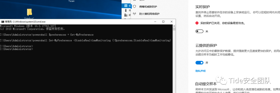 既然是管理员权限了我们甚至还可以利用powershell直接关闭Windows Defender。(只能关闭实时防护不能关闭主动扫描 主动扫描还是会查杀出问题)