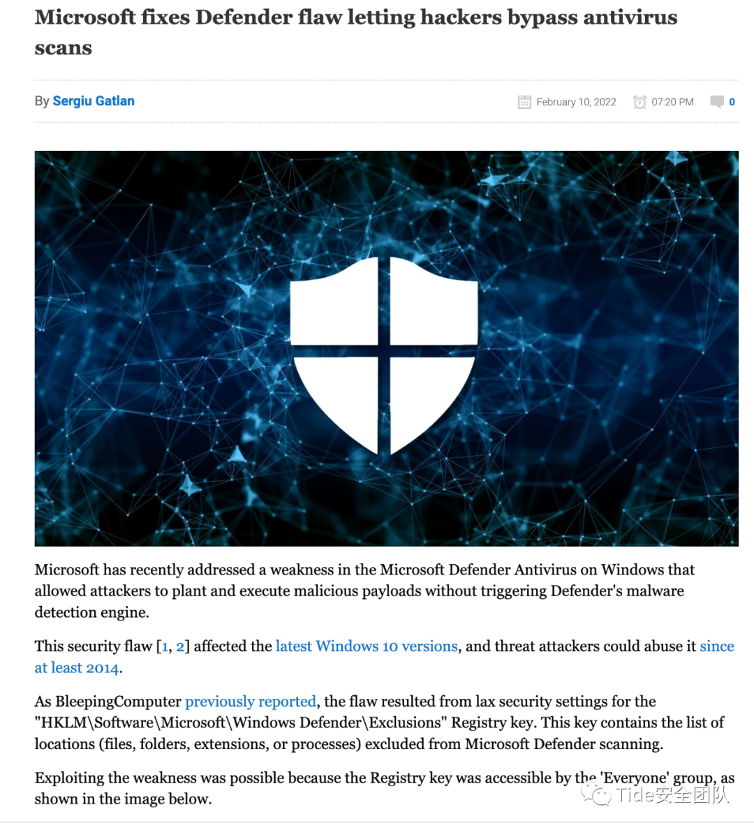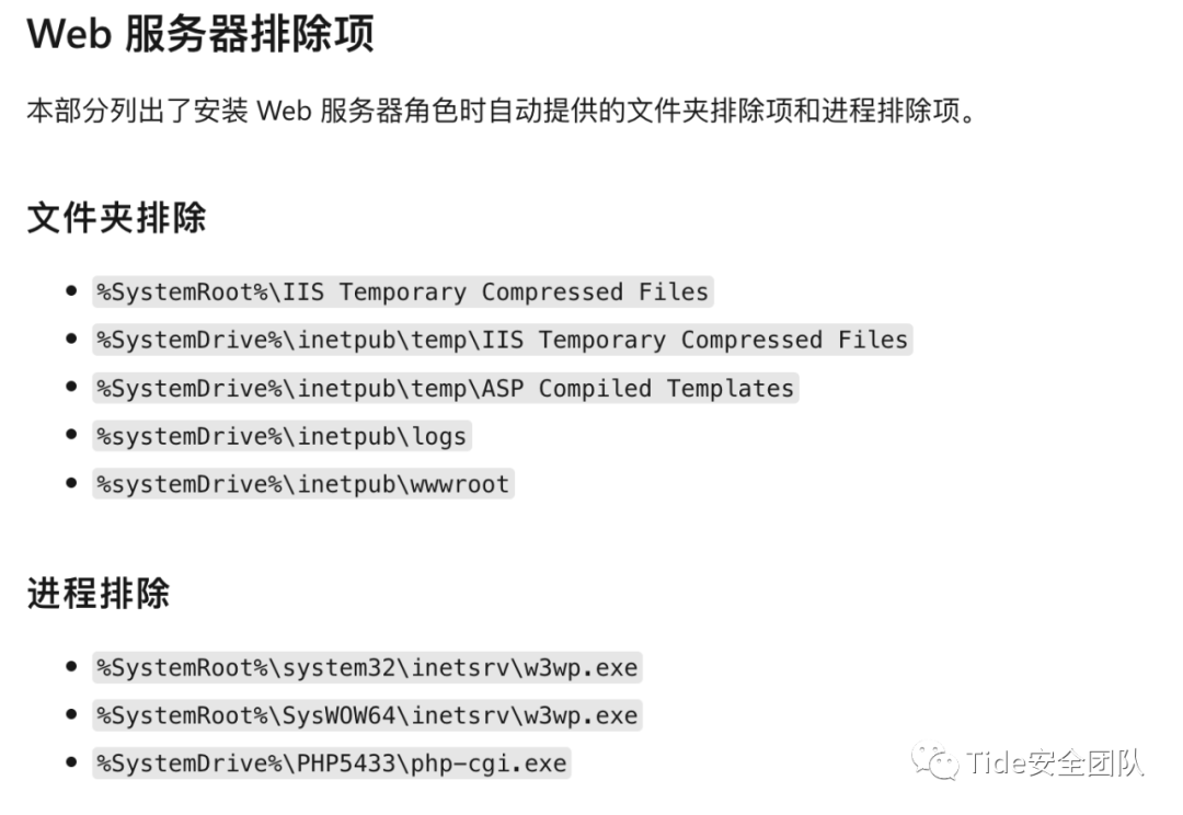 在Windows Defender的官方介绍中有一个叫做防病毒排除项,下面列出了一些进程、文件以及文件夹,这些进程、文件以及文件夹,是默认做为Windows Defender的白名单,所以我们可以对列出的的文件夹以及进程进行测试