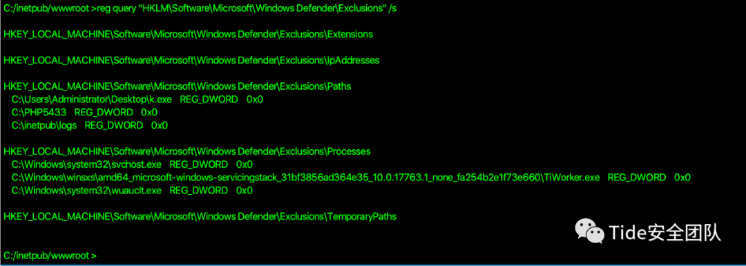 查看是否添加自定义排除项可以利用注册表,defender的排除项在注册表中可以查询到,而且查询的权限是everyone 任何权限都可以查看,这样我们就可以利用查询到的内容修改我们木马的名字以及路径。这里模拟了一下在冰蝎界面的查询(iis权限)。