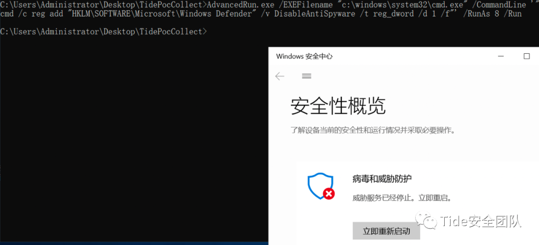 AdvancedRun.exe /EXEFilename "c:\windows\system32\cmd.exe" /CommandLine '"cmd /c reg add "HKLM\SOFTWARE\Microsoft\Windows Defender"/v DisableAntiSpyware /t reg_dword /d 1 /f"' /RunAs 8 /Run搞定。